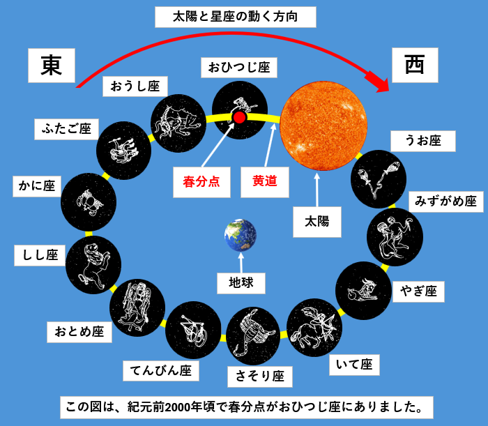しかし、古代メソポタミア時代(紀元前2000年頃)の春分点はおひつじ座の上にありましたが、4000年後の現在(西暦2000年代)では、地球の歳差運動により春分点の位置はずれて、うお座付近の上に移動しています。
