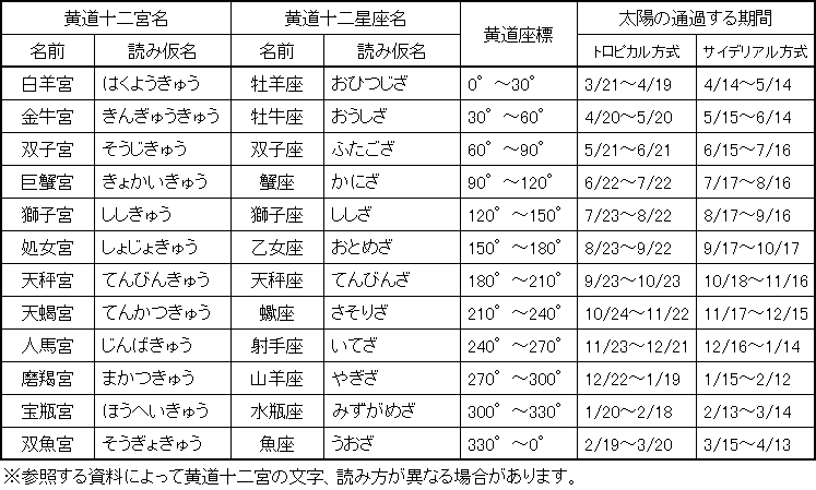 紀元前2000年頃に春分点を基準にして決められた黄道十二宮の領域に該当する星座名が使われています。