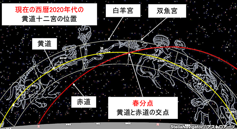 | 現在の西暦2020年代の春分の位置と黄道十二宮の位置 |