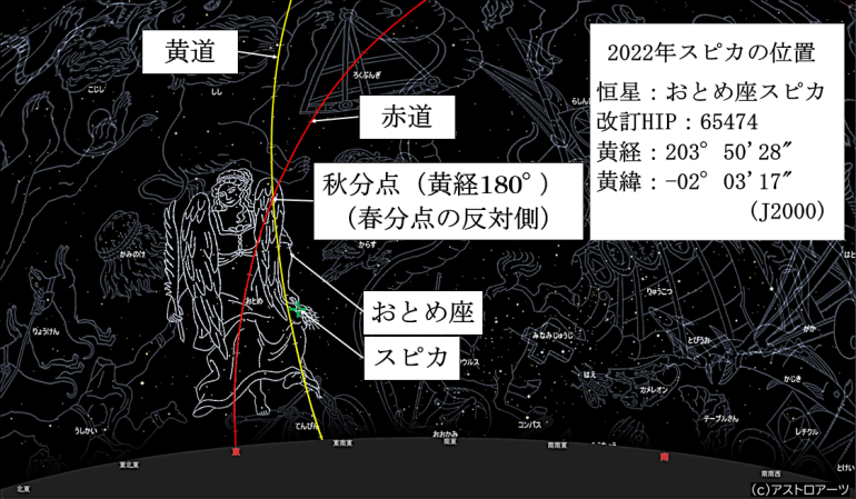 2022年現在のスピカの位置は、黄経203°50′28″ですので秋分点(黄経180°)より約23度51分(203°50′28″ー180°)ずれていることになります。(春分点のずれも同じです。)